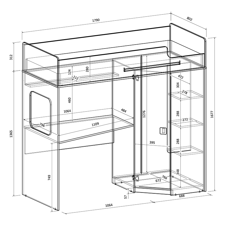 Высота кровати чердака всего 1677 мм.